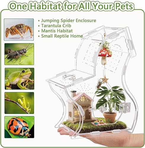 This all-in-one enclosure effortlessly adapts to be a perfect jumping spider habitat, tarantula crib, mantis den, reptile home, or ventilated cricket keeper. Assembly is incredibly simple – no tools required, just securely snap the panels together with the included straps. It also disassembles flat for compact, space-saving storage when not in use. (Substrate and decorations not included).