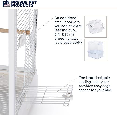 Top perch also doubles as a toy hanger, includes two water/food cup doors