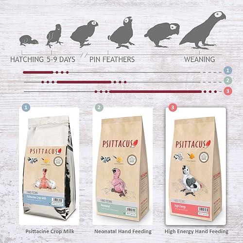 Specific Uses For Product: (function(f) {var _np=(window.P._namespace("DetailPageProductOverviewTemplatesJava"));if(_np.guardFatal){_np.guardFatal(f)(_np);}else{f(_np);}}(function(P) { P.when('A').execute(function(A){ A.on('a:truncate:po-attribute-truncate-4:updated', function(data) { var isTruncated = !data.truncateInstance.getIfTextFits(); var seeMoreElement = document.getElementById('po-attribute-see-more-id-4'); if(seeMoreElement) { seeMoreElement.style.display = isTruncated ? '' : 'none'; } }) }); })); PSITTACUS High Energy hand feeding is designed to constitute 100% of the parrot's diet from the moment pin feathers begin to emerge until weaning to the recommended bird species (African Grey, macaws, African parakeets). Mix with lukewarm water (98-102ºF) at a concentration of 20-25% (similar texture of a shaken yogurt or smoothie). Average intake is around 7-10 ml per 100 g of body weight and feeding bout. The number of feeding bouts per day depends on the stage of development of the chick. Crop should be full but not overstuffed. Confirm that the crop is empty in the morning. Leftover formula must be discarded after each feeding bout. It is advisable to use a first-age hand feeding formula for younger birds At weaning, switch progressively to the PSITTACUS Omega daily diet for one year. No vitamin or mineral supplements should be given to parrots whose staple food is PSITTACUS daily diets. See more