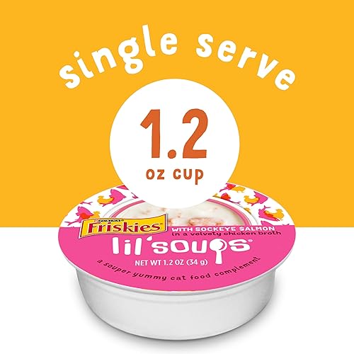 Each grain free Friskies lil' soups cat food complement in this variety pack is made with real seafood to delight your cat