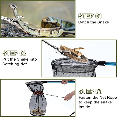 Humane Control with Secure Grip: Stainless steel construction and rubberized handles on the snake catcher grabber ensure steady handling. The snake tongs grabber's wide, smooth jaw disperses pressure to protect reptiles, while the 35” deep net locks snakes safely via buckle. Ideal for backyard nests, chicken coops, or rocky terrain