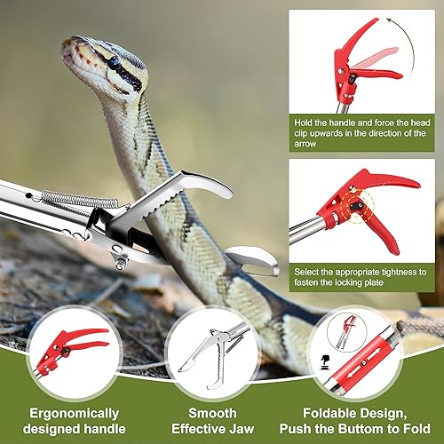 Professional Snake Grabber Tool Kit: Qualirey 127cm heavy duty aluminum alloy tongs triple fold to 17” for portability. Paired with a 40-60cm adjustable snake trap net and 50cm armored gloves, this snake tongs set humanely captures pythons, rattlesnakes, or cobras in gardens, camps, or trails. Serrated jaws prevent escapes, while thickened rods resist bending