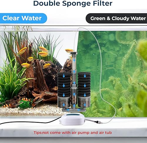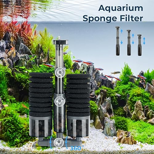 Upgraded filter: The fish tank sponge filter is ultra-quiet, features a tri-filter chamber design provides better water quality. The air outlet pipe has added bubble stones,the bubbles are finer. The multi-layer design of filter cotton ensures full filtration . The installation is more firm with three suction cups, and the bottom direction of the sponge can rotate 360 degrees