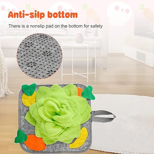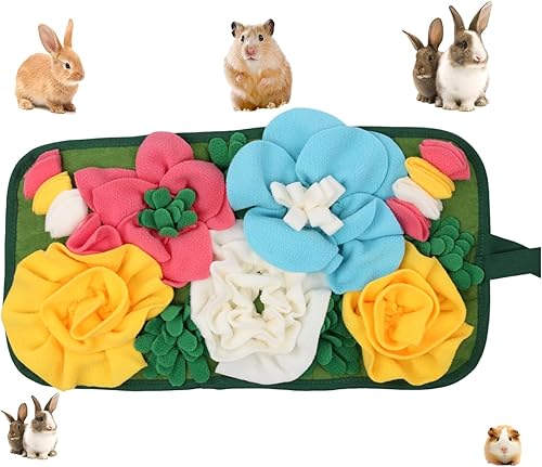 【Multifunction Snuffle Mat】Bunny mat engage your rabbit’s sense of smell: bring some excitement to your pet’s daily feeding routine by hiding various edible treats and pellets in all the fun different areas. With bright colors and eye-catching designs ( Flowers and carrots), it is enough to hides small pets snacks which make pets feel the nature.Practical feeding features keep your rabbit focused and relieve stress and loneliness.
