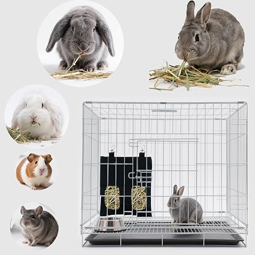 Practical Design: The hay holder for rabbits has 2 holes, which allow 2 pets to eat at the same time, and the top is designed with 2 metal buttons, rabbit hay feeder can be hung in the pet cage or anywhere else, so that pets can stretch their heads to eat, reducing waste and being very convenient and practical
