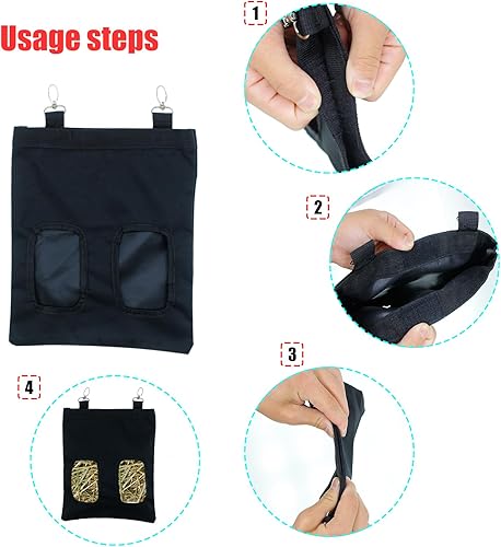 User-friendly Design: The metal hook allows you to hang the feeder bag in most cages easily,and thelarge opening with magic velcro closure for easy hay filling and avoid pets entering from the top. Small animal feeding bags is easy to clean and requires only hand washing and hanging to dry