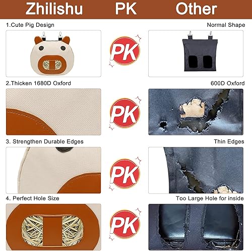 Durable & Bite Resistant --- The rabbit hay feeder is made of all-fabric,durable 1680D Oxford cloth material. It is safe for babies who love to bite. Most of the pet feeders on the market are made of plastic and the bites of rabbit have buried hidden dangers for their health. The bag hole is sewn with double layers of fabric, which greatly reduces the risk of gnawing damage.