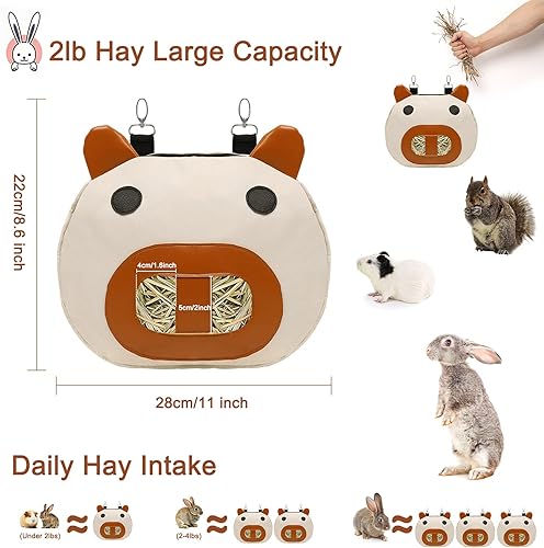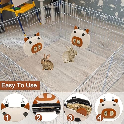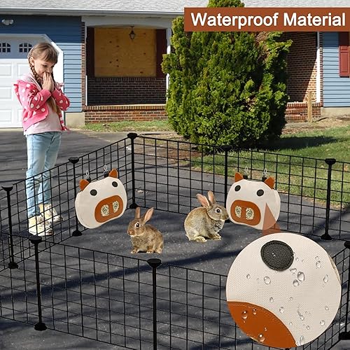 Cute Shape Hay Feeder Bag --- A hay feeder helps to keep the hay dry and clean, thus keeping your pet healthy and happy. The 2 holes of the right size (2' x 1.8' ) and the snap design at the bottom can prevent small pets from entering and pulling out the hay, avoiding waste. The cute pattern can be used as a decoration for the rabbit cage.