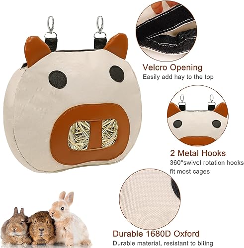 Easy To Use --- The hay feeder bag for rabbit is equipped with 2 metal hooks, which can be directly and quickly hanging on the top of the cage or use a rope to hang it where you want it to be, which is very simple and convenient to use.