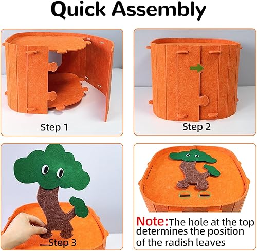 【Easy to assemble】: No tools required to assemble. Simply insert the edges of the top and bottom panels into the cylinder and add carrot leaves to finish. This rabbit hideout can be quickly assembled or folded into a flat surface for storage and travel. Side curved design, can be placed horizontally to enjoy the lazy time.