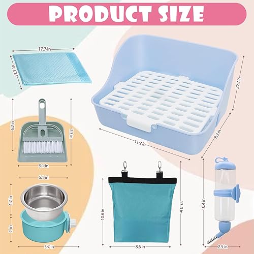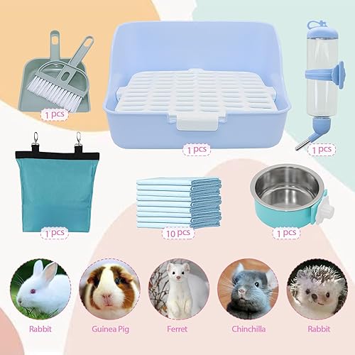PRODUCT CONTENTS: 1 Pcs Bunny litter box + 1 Pcs Hanging bowl + 1 Pcs Water dispenser + 1 Pcs Hay feeder + 10 Pcs Pads + 1 Kit cleaning broom. Enough for your pet including rabbits, bunnies, guinea pigs chinchilla ferrets, etc.