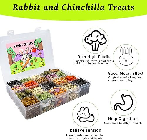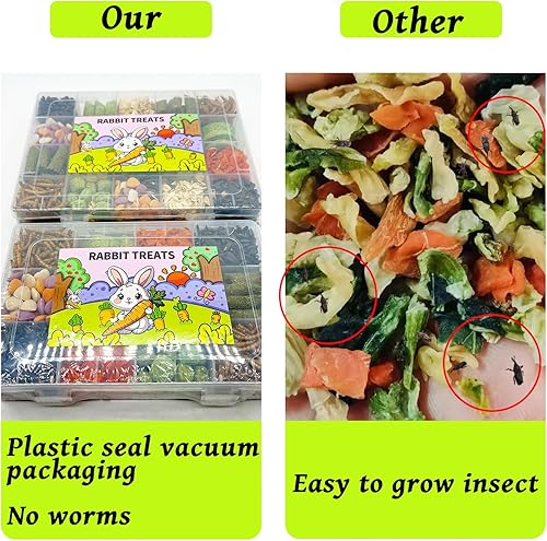 【No worms】We have screened the raw material of the rabbit treats without moisture, which is sealed. Each treat we selected is less perishable and insect-free than the insect-prone treats boxes on the market. Your pet can eat for a long time.