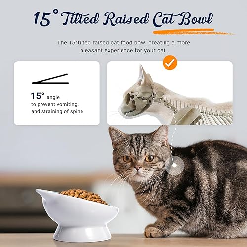 【Scientific Feeding & Reduce Burden】Our raised cat food bowls provide numerous benefits to your furry friends. 1.2in raised base design helps to reduce neck strain and avoid excessive head bending to prevent vomiting; the 5.3in bowl diameter and 15° tilt design help to concentrate the food together, making it easier for the cat to eat and preventing whiskers fatigue.