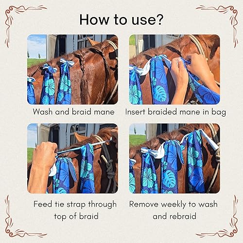 Simple Application: The usage instructions are simple and easy to follow. There are no complicated steps involved. After washing and conditioning your horse's mane, you can easily braid it into 2-3 inch sections, secure it with rubber bands, and then insert the braided mane into the bag. Tie off using the provided straps, repeating the process until the entire mane is safely enclosed