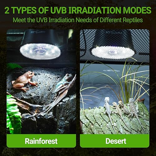 【2 Illumination Modes】: Our UVB Light for Reptile has 2 switchable modes - Tropical Mode (UVB5.0, suitable for reptiles in tropical habitats); Desert mode (UVB10.0, suitable for reptiles in desert habitats). Easy to switch, meets the specific UVB requirements of different reptiles. Regardless of their natural habitat, pets can benefit from precise UVB irradiation to ensure their healthy growth