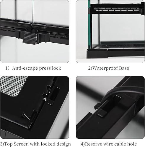 【Metal Screen Ventilation】:Our reptile glass tank is topped with a movable metal mesh, so your pet can enjoy optimal airflow and ventilation, UVB and sun penetration and domed lighting. The power cable is also reserved on the top for easy use.