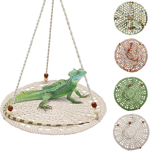 2.Great for most climbers: Bearded dragon circular hammock swing net has a diameter of 10 " and it is completely handwoven and it’s durable without any chemicals odor. This climbable lounger, perfect for arboreal reptiles and amphibians. Suitable for bearded dragons, guinea pig, lizards, small birds like parrot, parakeet, cockatiel, snakes, geckos and other reptiles.
