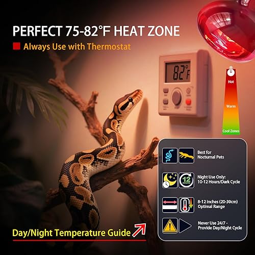 【Zero UVB Safe Heating】Reptile heat lamp provides 100% UVB-free infrared heating for nocturnal pets like leopard geckos and ball pythons, safely maintaining ideal 75-82℉ basking temperatures.