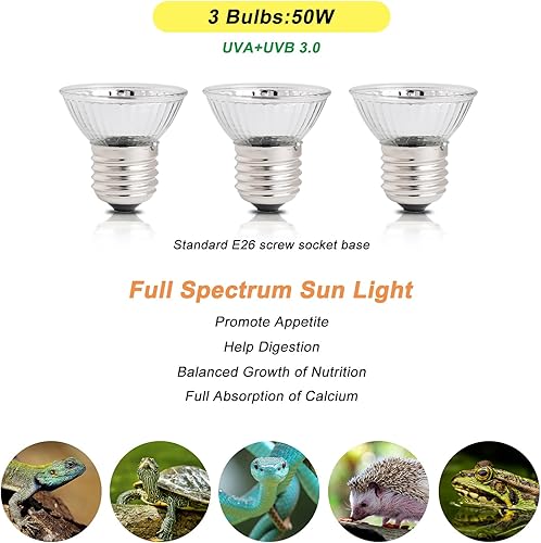 3 Pcs 50W Bulbs for Replacement - 50W UVA/UVB reptile heat lamp can simulate sunlight to provide reptiles with daily UV(UVA/B) intake, stimulates growth. UVA can promote appetite, UVB can promote the absorption of calcium in reptiles.