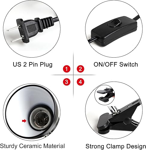 High Quality Material - Clip Lamp head use frosted all-metal high temperature resistant ceramic materials.Independent ON/OFF Switch, can freely adjust the brightness and temperature of the lamp, safe and energy saving.