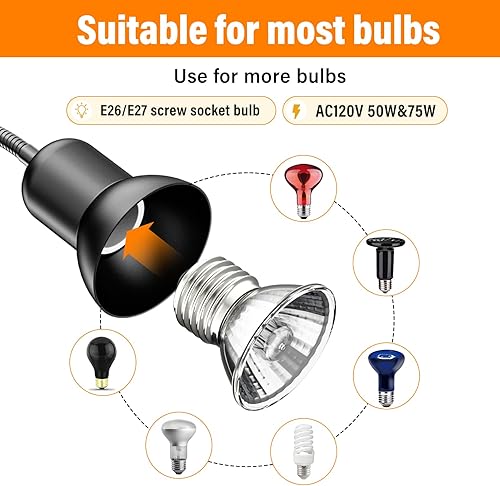 【Upgraded Quality Material】 :The reptile heat lamp clip, lamp tube and lampshade are made of high-quality metal, featuring heat resistance. The clip has a stronger gripping force. It can be firmly and easily installed in any position and fixed effectively. It has two built-in electroplated bulbs, with power ratings of 50W and 75W respectively. The silver-plating process is adopted to ensure anti-oxidation and explosion-proof performance, and the vacuum glass tube extends the lifespan of each bulb. These bulbs simulate the solar spectrum and increase the temperature to achieve the best health condition for pets.