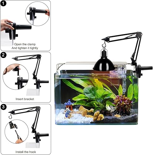 Easy to Use: Insert the metal bracket into the hole you want to place it, then clamp the clip-on base on the glass tank or table, and finally tighten it. Spiral locking structure, which can be fixed without shifting
