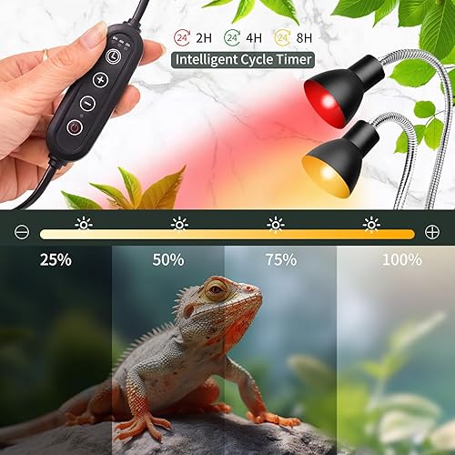 Heating lamp for reptiles with 3 timer function for you to set 2/4/8 hours which will switch ON/OFF automatically.And just press the +/- button simply to adjust the bulb's brightness in 25%/50%/75%/100% and temperature to meet your reptile's needs.