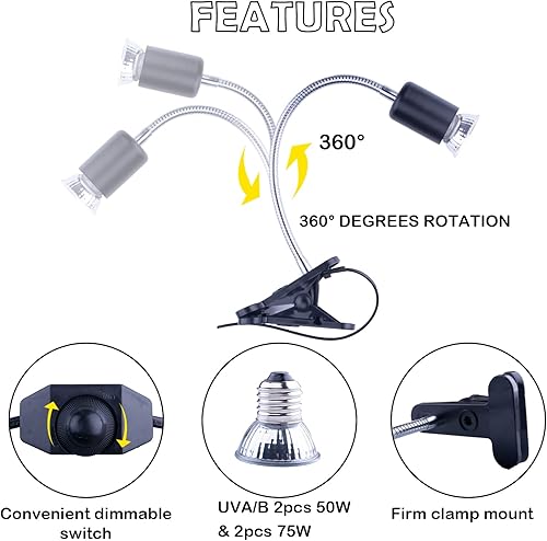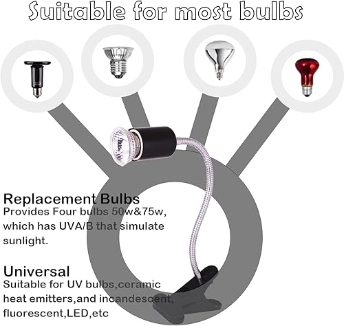 Get:There are 4 bulbs in total(2PCS 50W + 2PCS 75W),1*Reptile heat lamp stand,strong stability clip design,360 degree adjustable heat lamps holder stand with clip design which with strong stability.