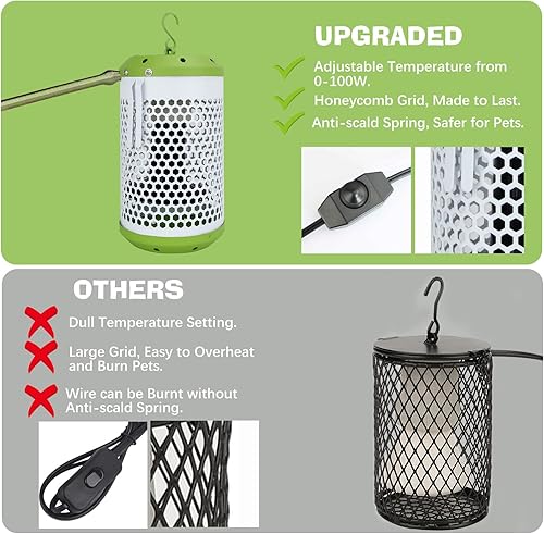 【Reptile Heat Lamp with Guard】:Reptiles and amphibians tend to approach heat sources when they feel cold. That's why it's better to use a reptile heat lamp with a guard, which keeps your pet at a safe distance from the heat source, reducing the risk of burns and protecting them from heat injury.