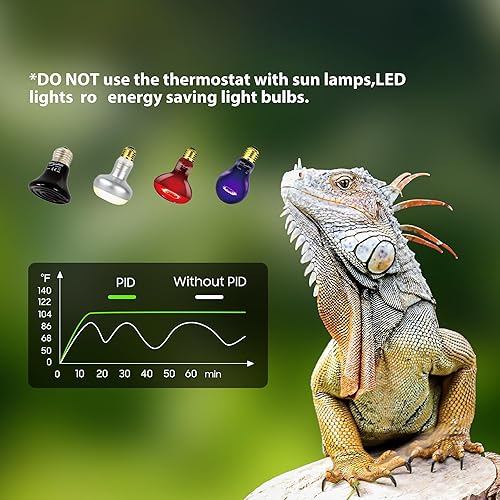 【Essential PID Thermostat for Reptiles】: The PID Heating Pad Thermostat is a reptile's best friend! It comes with a large digital display that allows you to easily monitor real-time temperatures. It features a PID function for improved temperature accuracy and stability, as well as a dimmer function to adjust the brightness of the heat lamp for your reptile's comfort!