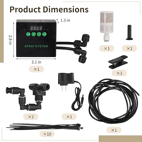 Complete Accessory Kit: Includes misting host, water filter, 2 adjustable nozzles, tubing, tube cutting tool, plug, power adapter, 10 zip ties, and a user manual; everything needed for quick setup; fits easily into terrariums or enclosures