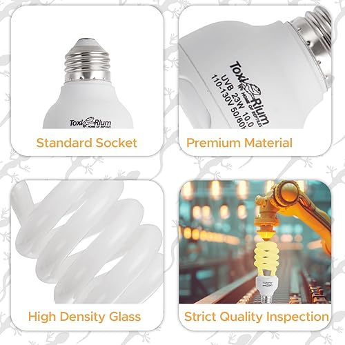 High Performance. Easy to install with an E26 base, each 23-Watt Desert UVB 10.0 CFL Reptile UVB Bulb offers stable UVB and UVA output with no harmful UVC output. Always keep your lamp at least 15 cm away from your reptiles.