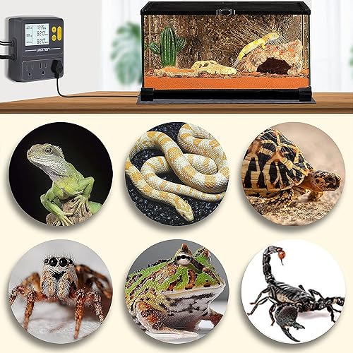 Timer thermostat for reptiles, 3 plugs outlet can work independently. Integrated design with day/night temperature and timing control, which can meet the physiological needs of temperature, and lighting for reptiles, amphibians, or plants.