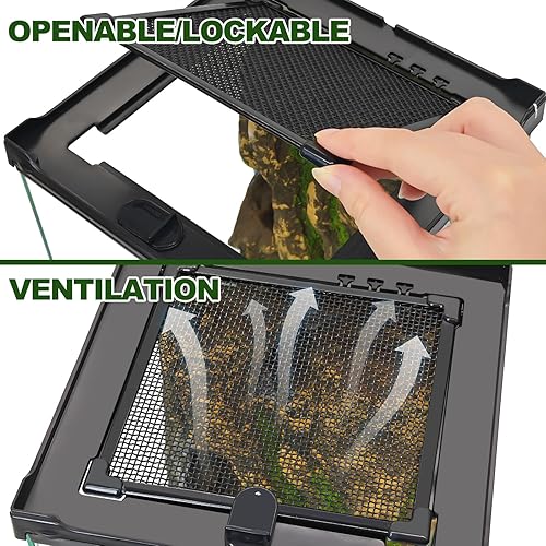 Convenient Design and Functionality:The front-opening door design simplifies feeding, cleaning, and adding decorations, while the anti-escape safety lock ensures the safety of your pets. The top ventilated cover features a hinged design that not only provides an additional access point but also includes an anti-escape safety lock to further enhance security. Additionally, the powder-coated screen mesh prevents rust, ensuring that the habitat maintains its quality over long-term use.