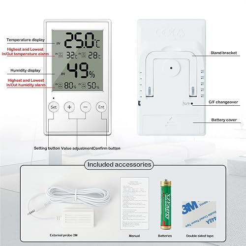【Main specifications】Thermometer and hygrometer material: ABS resin. Dimensions: 3.8" x 2.3" x 0.6"(97*58*15mm). The length of the probe is about 2m. Weight: 76g. The measurable temperature range is +14℉〜+122℉(-10℃〜+ 50℃). The measurable humidity range is (20% to 95%RH). Temperature accuracy: within ±2℉(1℃). Humidity accuracy: within ±3%rh. Power drive: 1 AA battery (included).