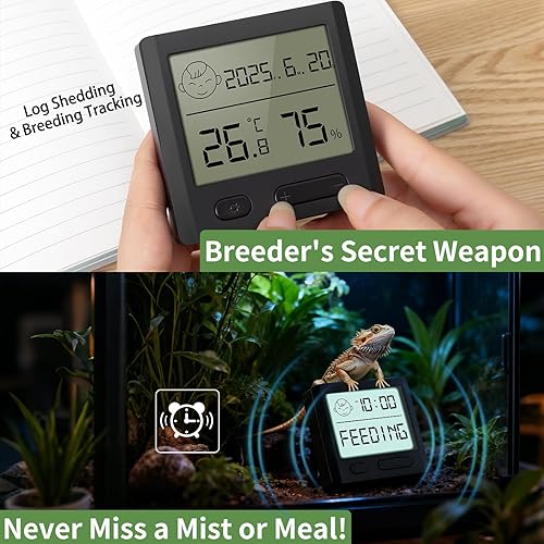 Precision Monitoring – High-accuracy sensor (±1.8°F/ ±1% RH) for 24/7 temperature & humidity tracking, ideal for tropical/desert reptiles.