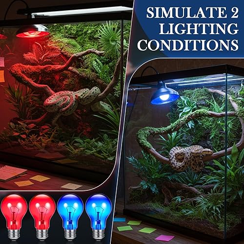 Versatile Lighting Options: available in red and blue, these bulbs cater to the varying needs of your reptiles with ease; Their dual color design allows for suitable day to night transitions, simulating natural light conditions, making it a versatile choice for any pet enclosure