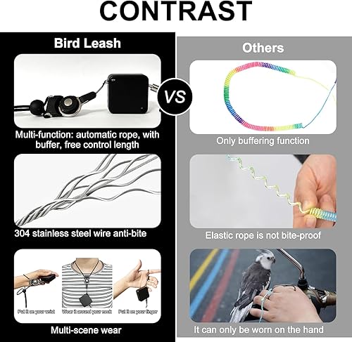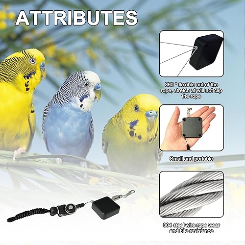 Auto-retractable:The bird leash has a certain amount of tension, after receiving an external force, the release rope will automatically eject, playing a certain buffer role, just like elastic rope, so when the bird suddenly scared away, in the role of buffer, you can greatly protect the baby bird's feet will not be torn.