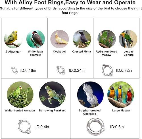 The parrot leash comes in three different sizes foot rings:(I.D.) 1pcs 0.16in,1pcs 0.24in,1pcs 0.32in,1pcs 0.4in,1pcs 0.6in,easy installation.