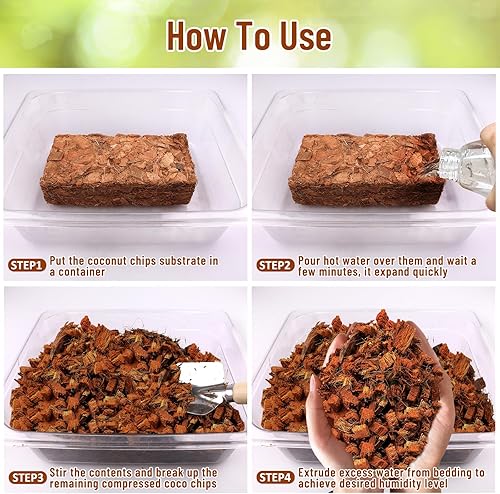 Easy to Use and Disposal: Simple to use, just add water and wait for it to expand, squeeze out the excess water and you're ready to go! Our coconut substrate chips have super odour and dirt-absorbing abilities, which effectively breaks down odors and waste. It not only safe for animals, also can throw it directly in the garden to compost for growing flowers, vegetables and fruits