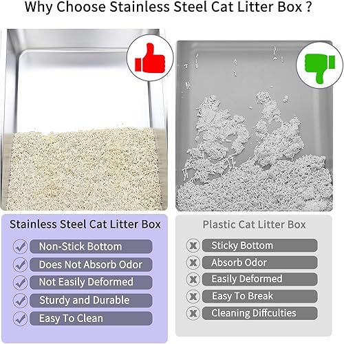 [Large Stainless Steel Cat Litter Box – Perfect for Big Cats & Multi-Cat Homes] The spacious design (23.8" x 16" x 12") provides comfort for cats up to 20 lbs. Ideal for large cats, multi-cat households, or active kittens, ensuring they have enough room to move freely.The litter box can hold about 20L of cat litter at a time, reducing your trouble of frequent litter changes.