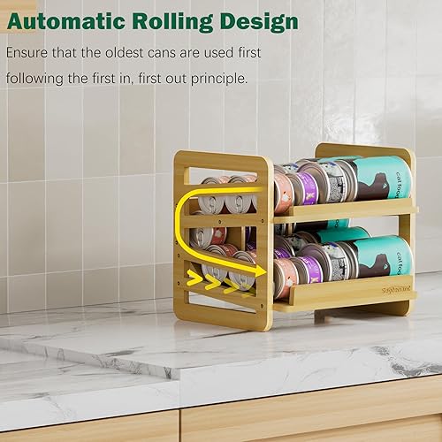 Bamboo Material: Made of natural bamboo, this cat food can organizer is both safe and sturdy, featuring a smooth polished finish. It promises stability without sagging or shaking, unlike metal or plastic options, even when fully loaded. Assembly is simple, ensuring a hassle-free experience while making an environmentally conscious choice for your kitchen organization needs