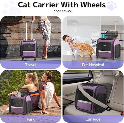 [Large Capacity]Our rolling cat carrier is suitable for a big cat, a medium-sized cat, two small cats, one or two small dogs. The dog carrier with wheels measures 16"x16"x13", recommended for pets up to 18 pounds. The cat carrier also features 1 storage pocket, ideal for storing pet supplies, food, water, and other essentials, making travel more convenient