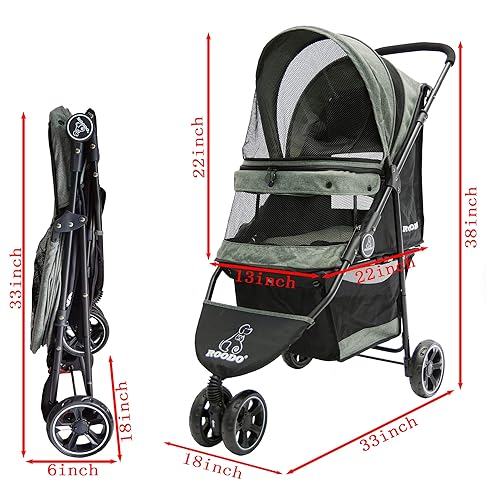 ROODO multifunctional three-wheeled pet stroller is smooth and easy to use. The pet rest area is covered with multi-directional breathable nets to enjoy the fresh air and protect your pets from insects. Equipped with a storage basket for easy storage of items. The pet stroller can be folded easily and compactly enough to fit into the trunk of the car. It is a great choice for walking, jogging, and traveling. Bring your pet to enjoy outdoor activities with you.