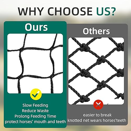 【Knotless Hay Net】:Knotless nets are gentle on horses' gums and teeth, reducing dental risks. For overweight horses, slow-feeding nets control eating speed and prevent overeating, helping maintain ideal weight.