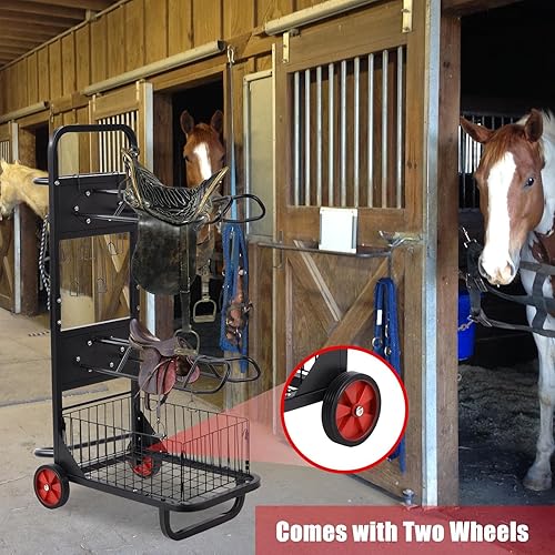 Abundant Storage - The horse equipment cart is approximately 48.6 inches high, 29.5 inches long and 15.75 inches wide at the bottom; The cart contains 2 saddle racks and 1 sturdy metal frame at the bottom; Ample storage space to display your saddles for easy access, improve efficiency, and bring a neat and organized storage experience