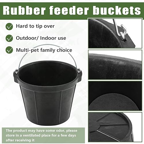 Large Capacity for Long Using: these feed buckets are heavy and less likely to tip over or be kicked over; And they have a wide range of applications, catering to various animals; Suitable for medium animals, such as goats, pigs, and horses, they offer a versatile feeding solution for your furry or feathered companions; Warm tip: the rubber may have some odor, please store in a ventilated place for a few days after receiving it
