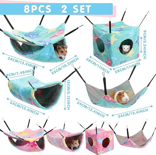 8 Ferret Hammock Set: you'll receive 8 ferret hammocks in adorable starfish green and starfish pink colors, 2 of each of the 4 styles; Quiet square nest, light hammock hanging, deep tunnel hiding, quare blanket; These are convenient for changing out on wet days like snowy days, providing a versatile option for multi-pet households to keep their pets happy and active