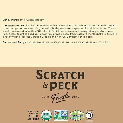 Well Rounded Diet - Paired with Scratch and Peck Organic Layer Feed or Scratch and Peck Grower Feed, using our whole grain barley as a separate hen bird feed or an additional chicken scratch treats, your flock will have all the nutrients and more produce