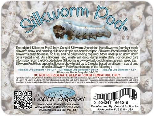 Pod Sizes: Small pod contains 50 silkworms (1/8-1/2 inch), medium pod contains 30 silkworms (3/4-1 inch), large pod contains 25 silkworms (1.5 inch)